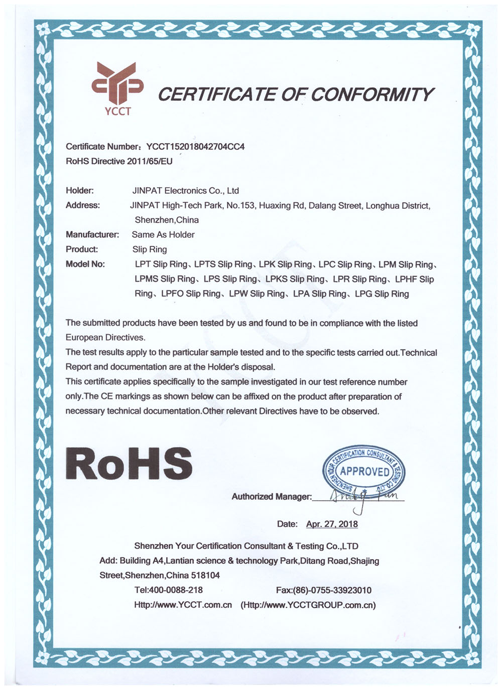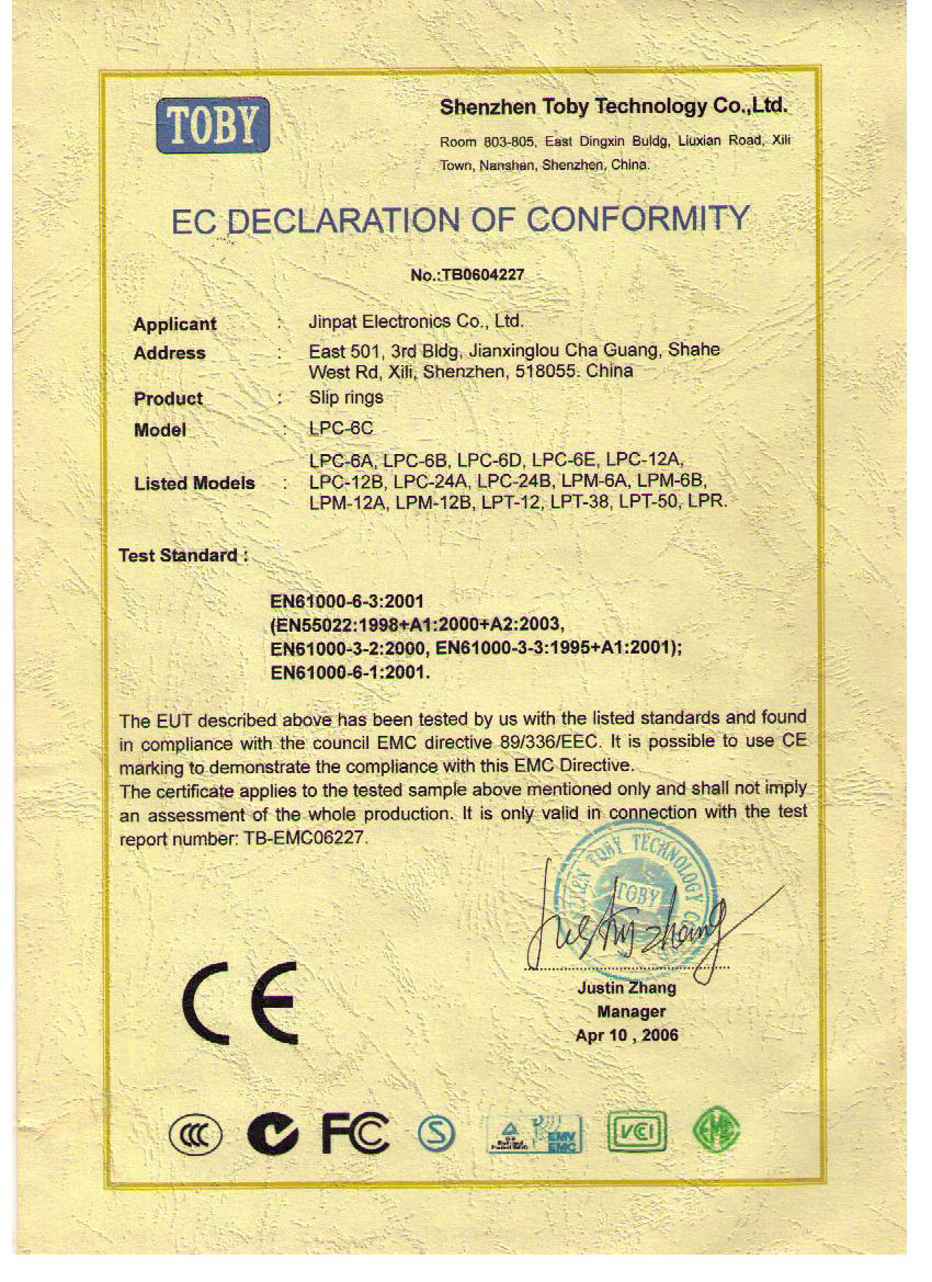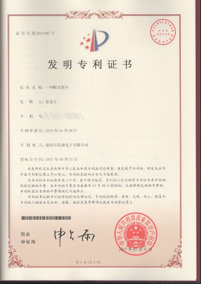 晶沛通過(guò)了歐盟CE認(rèn)證万古长青、FCC認(rèn)證珠联璧合、SGS認(rèn)證胜券在握、BV“船級(jí)社”認(rèn)證、防爆認(rèn)證等多項(xiàng)認(rèn)證,生產(chǎn)的導(dǎo)電滑環(huán)都符合RoHS環(huán)保要求,先后被授予“國(guó)家高新技術(shù)企業(yè)”稱(chēng)號(hào),目前已獲得45項(xiàng)專(zhuān)利,其中發(fā)明專(zhuān)利6項(xiàng)。